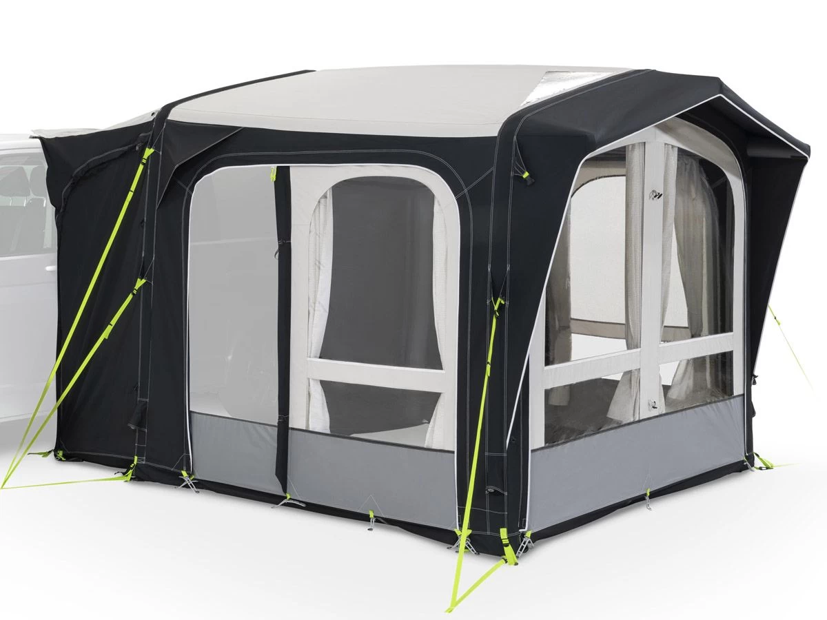 De Dometic Drive-Away-serie bestaat uit vrijstaande, opblaasbare bustenten die je op verschillende manieren aan je bus kan bevestigen. Vouw de tent uit, sluit de meegeleverde handpomp aan en na een paar minuten pompen staat de voortent al volledig opgesteld.