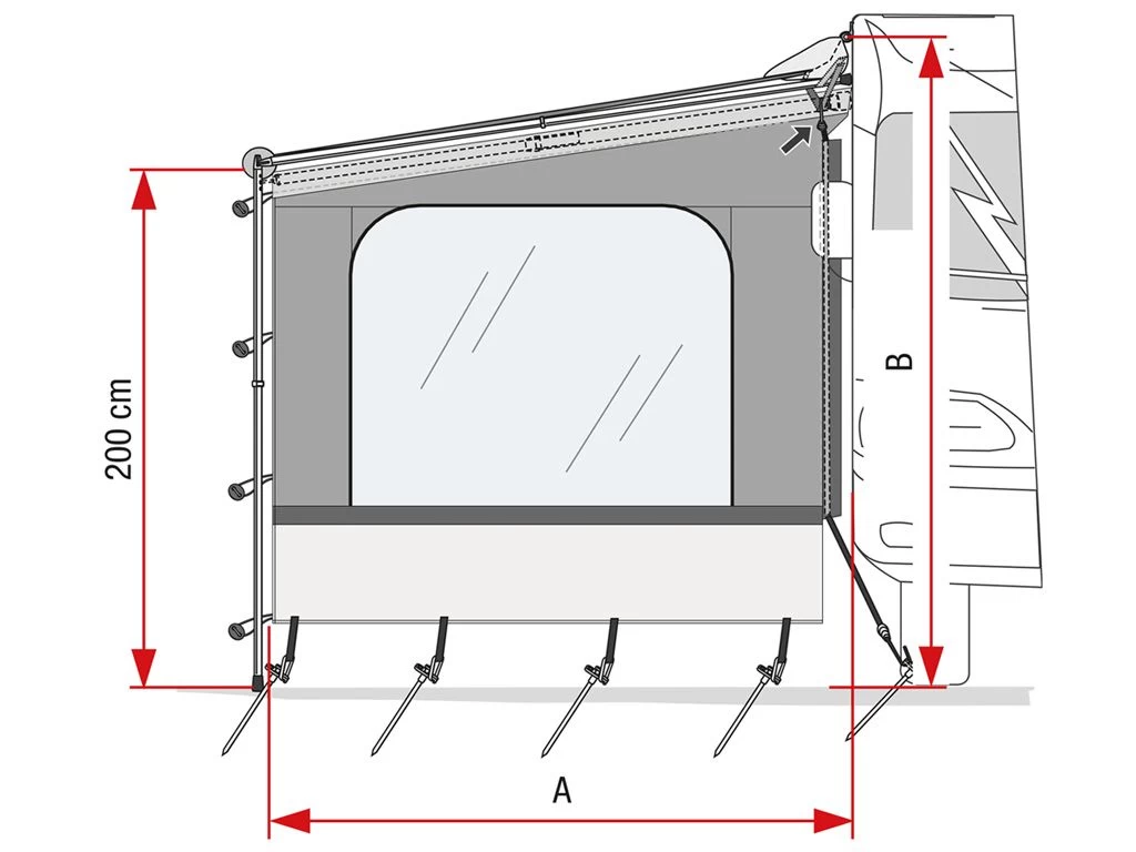 Deze zijwand past voor een aanbouwhoogte van 240 tot 260 cm. De aanbouwhoogte meet je vanaf de caravanrail tot aan de grond. Deze hoogte is passend voor standaard caravans van bijvoorbeeld Hobby, Fendt en Dethleffs.