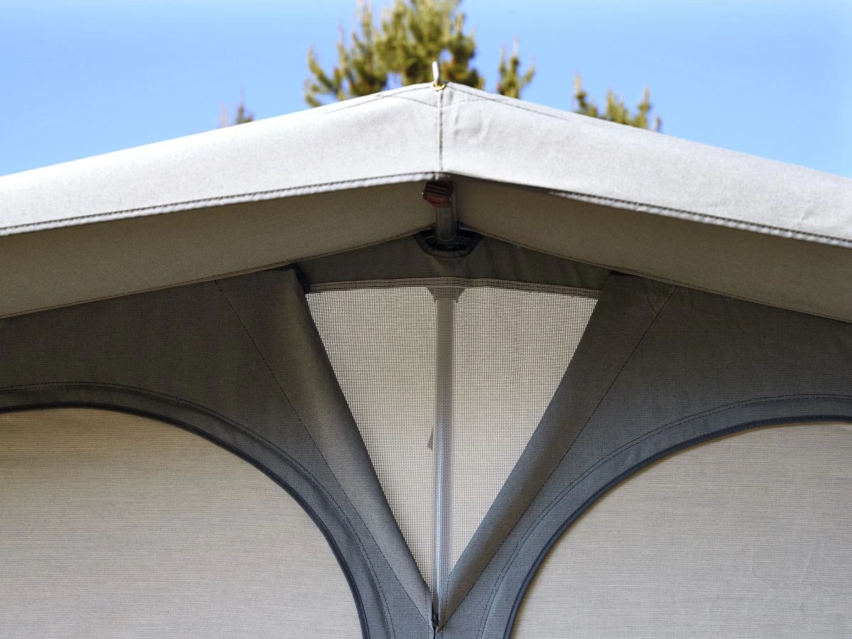 De grote ramen in de front- en zijpanelen zijn rond afgewerkt in de bovenste hoeken en zorgen samen met de hoge ramen achter in de zijwand voor voldoende licht in de gehele voortent. Het ademend Isacryl materiaal is bijzonder kleurvast en zorgt samen met de ingebouwde nokventilatie voor een prettig binnenklimaat. Op warme dagen bieden de insectenhorren in de beide zijwanden voldoende ventilatie.