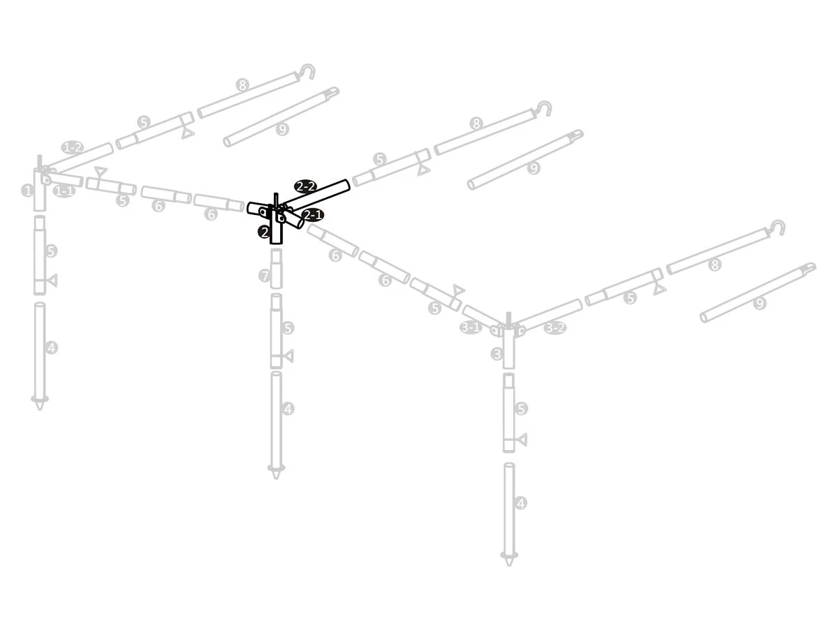 Dit stalen middenkruis met een diameter van 25mm is een standaard Hypercamp luifelframe. Het nummer op het frameschema is 2.