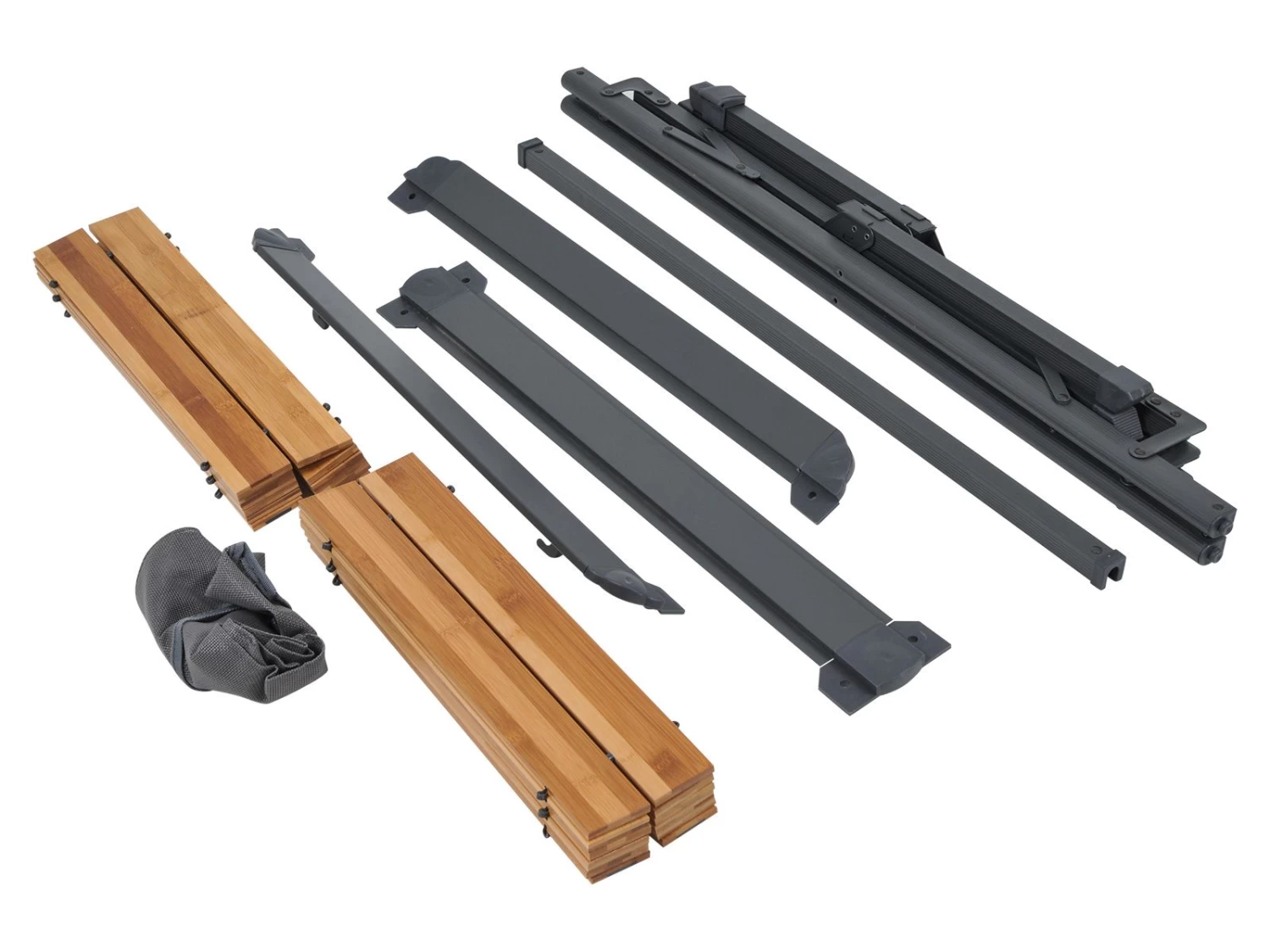 Het frame is gemaakt van licht gewicht aluminium in een zwarte kleur. Het tafelblad is gemaakt van bamboe en is oprolbaar. Hierdoor kun je de tafel makkelijk uit elkaar halen en tot een compact pakket oprollen.