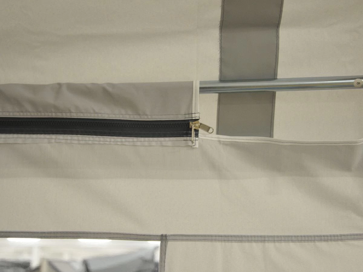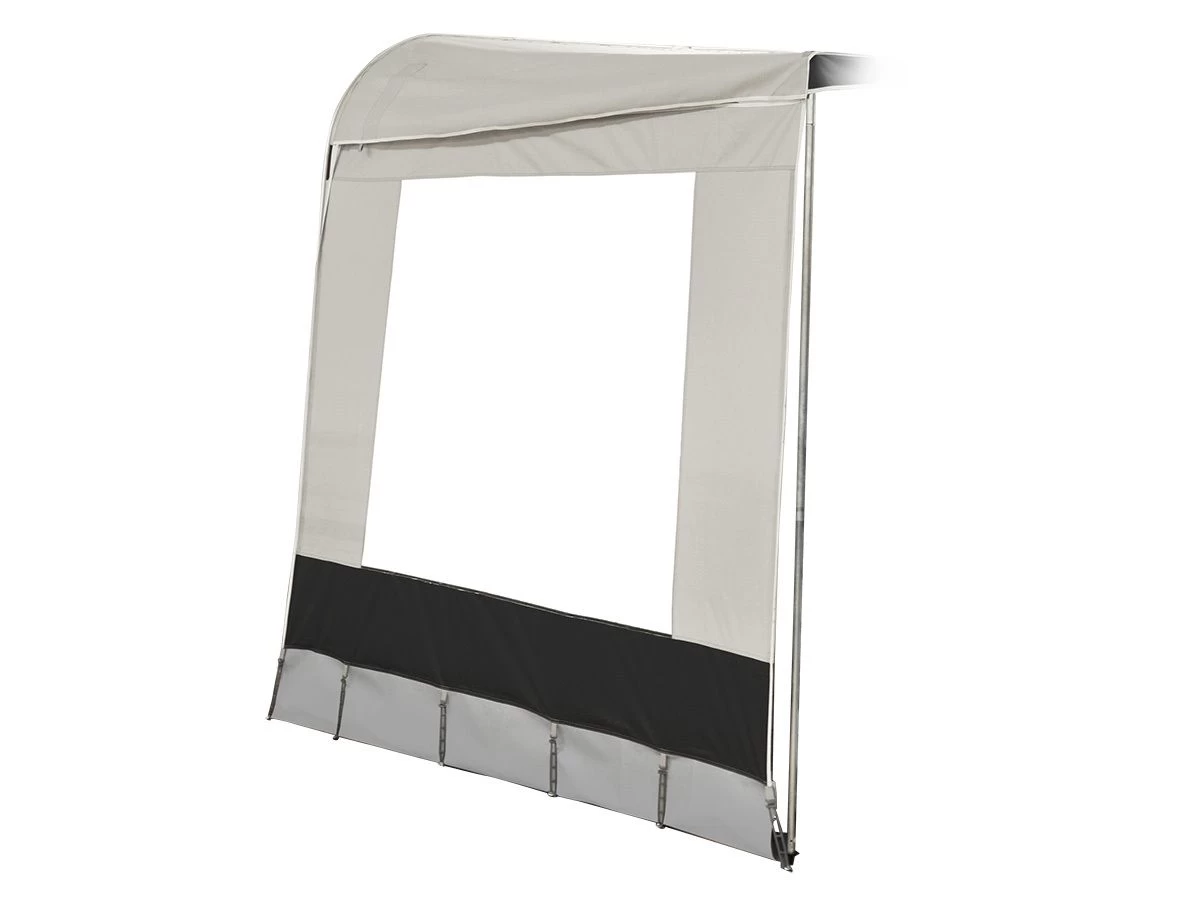 De zijwand is voorzien van een groot raam en kan zowel links al rechts gebruikt worden. De bovenzijde is voorzien van sleuven waar de dakligger van het luifelframe doorheen geschoven kan worden.