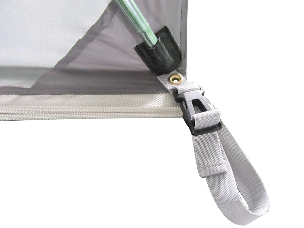 De Obelink Elbe is een koepelvormige luifel die voorzien is van 3 glasfiber boogstokken. Dankzij de diverse bevestigingsmogelijkheden kun je de Elbe op verschillende manieren gebruiken in verscheidene situaties en voor alle kampeermiddelen. Zo zijn de vier hoeken voorzien van ogen waar je staanders in kunt bevestigen. Standaard wordt de luifel met 2 luifelstaanders geleverd. Verder is de Elbe aan één voorzien van bevestigingsbandjes, een 5 mm pees en een 7 mm pees. Met de bevestigingsbandjes kun je Elbe bijvoorbeeld bevestigen aan een dakrail of een imperiaal en met de pezen kun je de luifel eenvoudig in een cassetteluifel of tentrail schuiven.