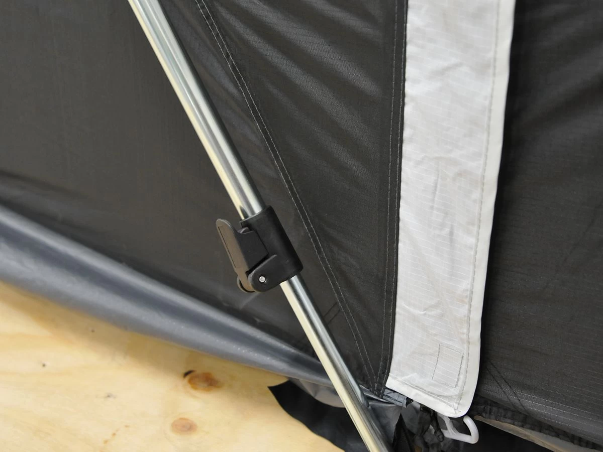 Standaard worden de scheerlijnen, haringen, het grondzeil, een tochtstrook en wielflap en een handige draagtas meegeleverd. Voor een goede aansluiting tegen de caravanwand zijn er schuimkussens aan deze voortent genaaid, deze kun je d.m.v. haringen vastzetten voor een goede tocht-dichte aansluiting met de caravan.