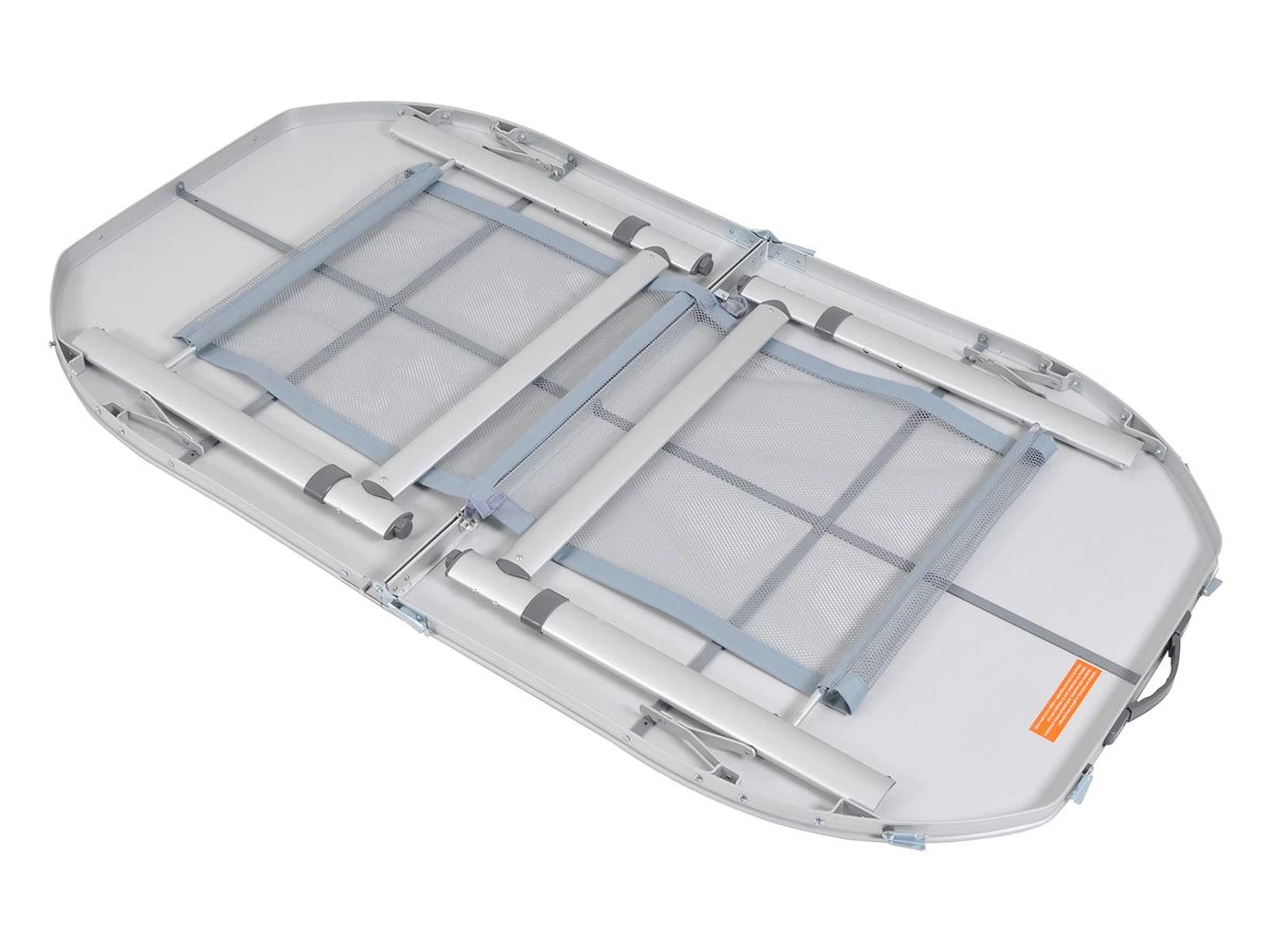 Onder het blad zit een handig lectuurnet zodat je altijd je boek of tijdschrift in de buurt hebt. Na gebruik is de tafel compact op te vouwen, door het deelbare blad kun je de tafel inklappen als een koffer.