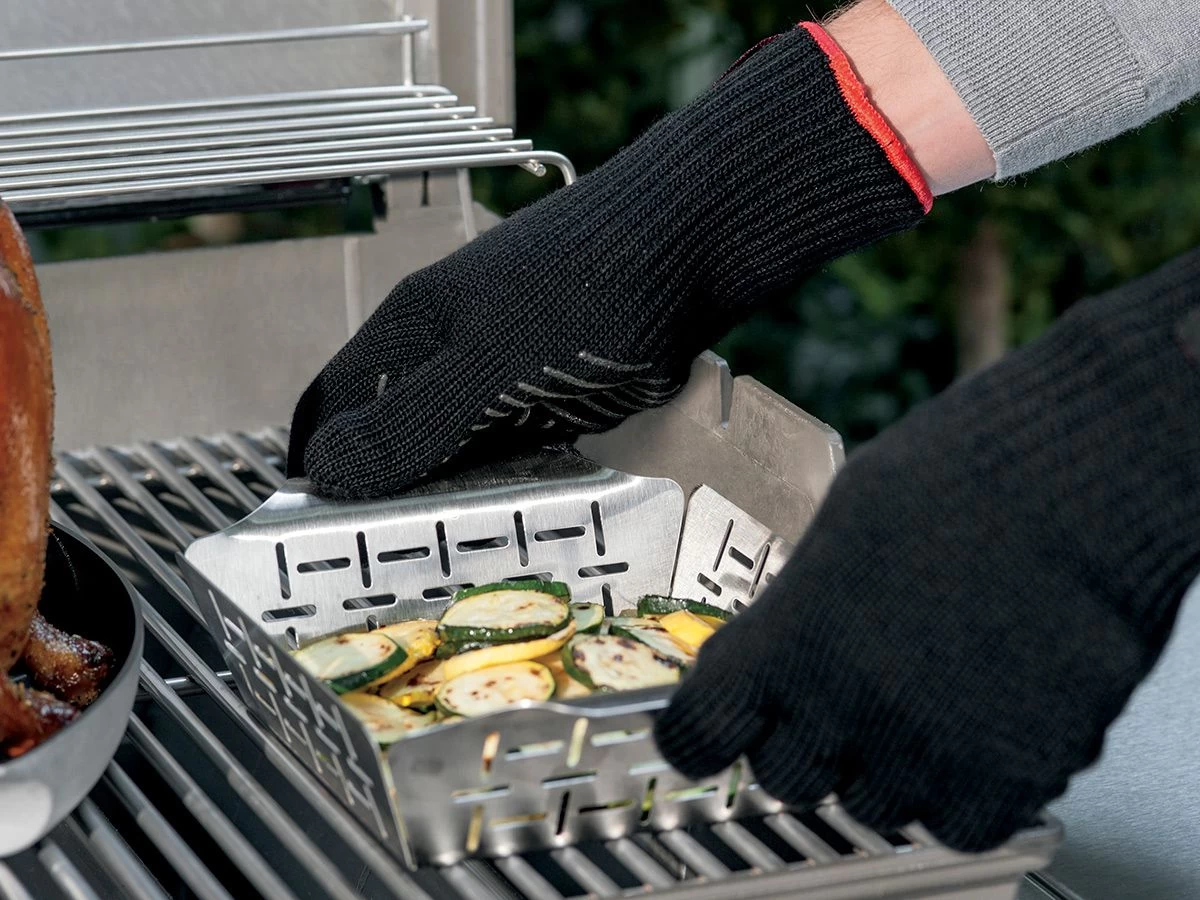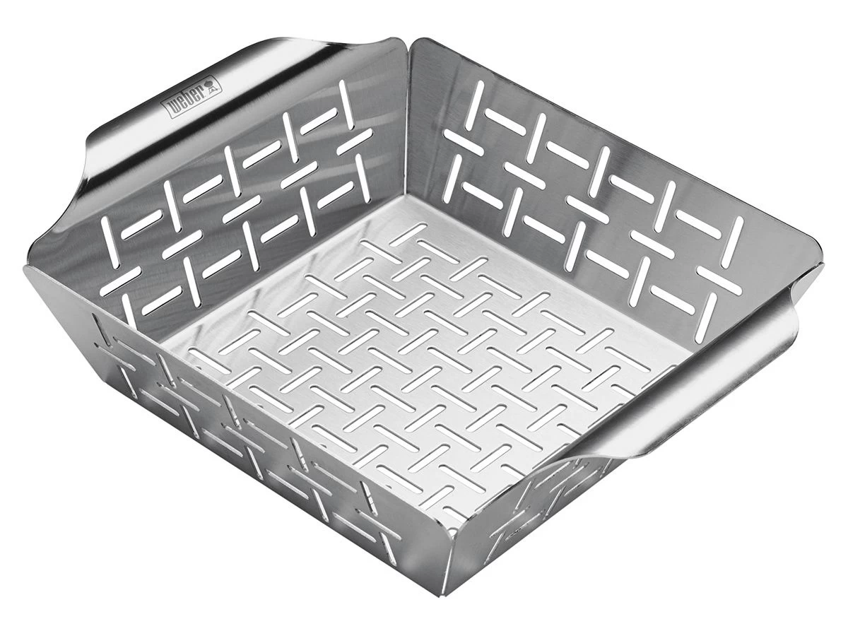 De Weber groentekorf is ideaal voor het bereiden van kleingesneden groenten. Snijd de groenten in stukjes of blokjes en doe ze in de groentekorf. Plaats de groentekorf op de barbecue.