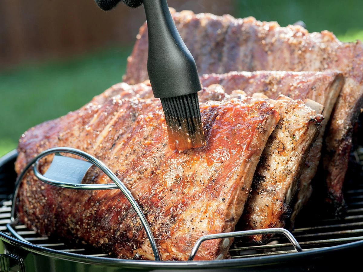 Het Weber ribbetjesrek is een roestvrijstalen rek waar vijf spareribs in kunnen. Het vlees gaart op deze manier gelijkmatig.