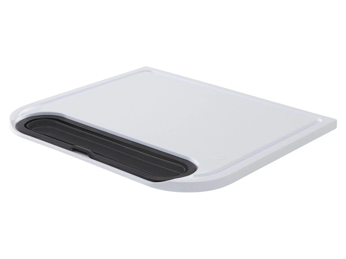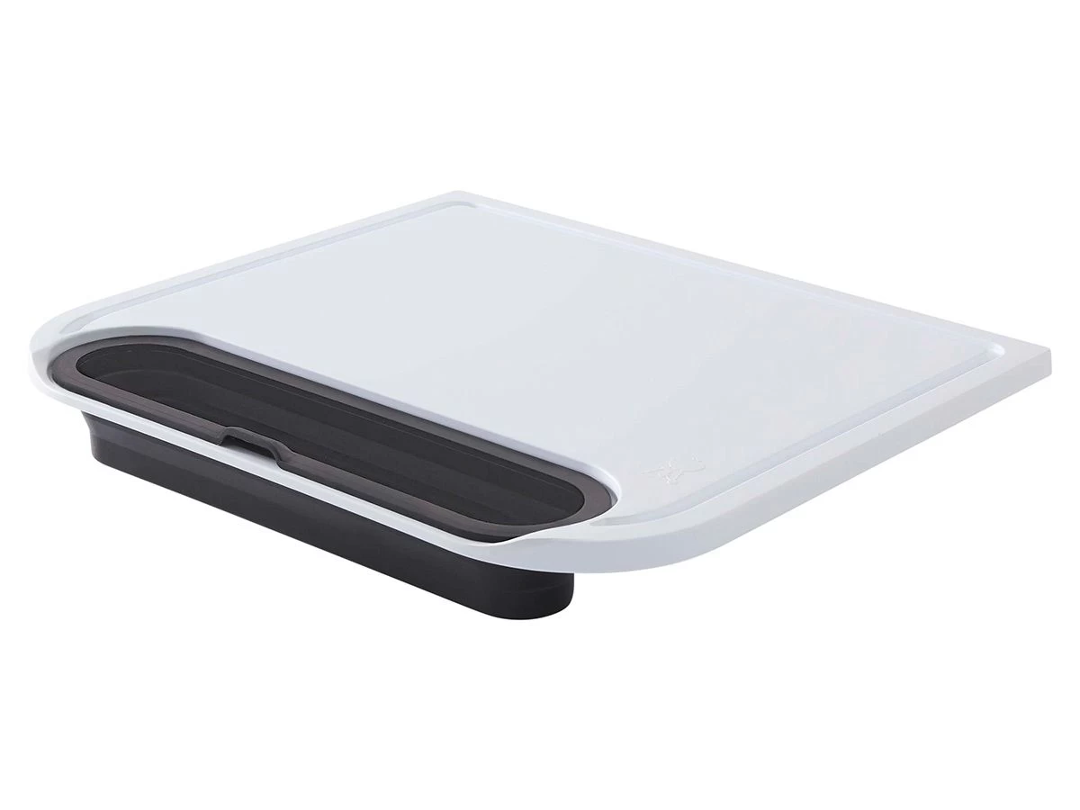 Het afvalbakje is inklapbaar en neem weinig ruimte in tijdens het opbergen. Verder is de snijplank rondom voorzien van een gleuf om het sap of vocht op te vangen. De Traveler snijplank is niet vaatwasmachine bestendig en dient met de hand afgewassen te worden.